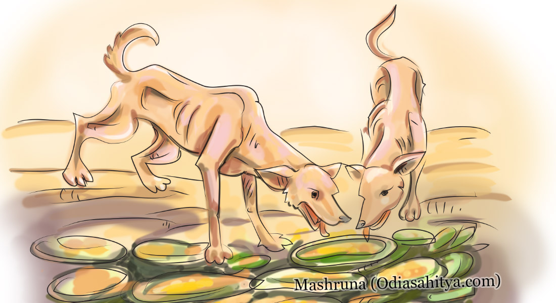 ଭୋଜି ଯାଗା। ଅଇଁଠା ପତ୍ର ଉପରେ କାଉ କୁକୁରଙ୍କ ଯୁଦ୍ଧ। ସେଇଠି ଚାରୋଟି ଧୂଳି ଧୂସରିଆ ଛୋଟ ଛୋଟ ପାଦ ମୁହୂର୍ତ୍ତକ ପାଇଁ ଅଟକି ପୁଣି ଆଗକୁ ଚାଲିଗଲା।