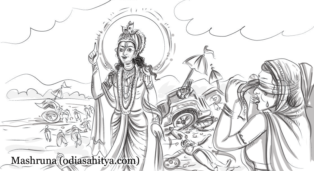 ଆଶ୍ରୟ ପାଇଁ ଶୁନ୍ୟରେ ଶୁଷ୍କ-ଚର୍ମବୃତ ଦୁଇ ଶିରାଳ ବାହୁ ତୋଳି, ଅନ୍ଧପଟ୍ଟିକାବୃତା ବୁଢ଼ୀ ଗାନ୍ଧାରୀ ଅସହାୟ କଣ୍ଠରେ ଚିତ୍କାର କଲେ…“ବିଦୁର, ସଞ୍ଜୟ!”